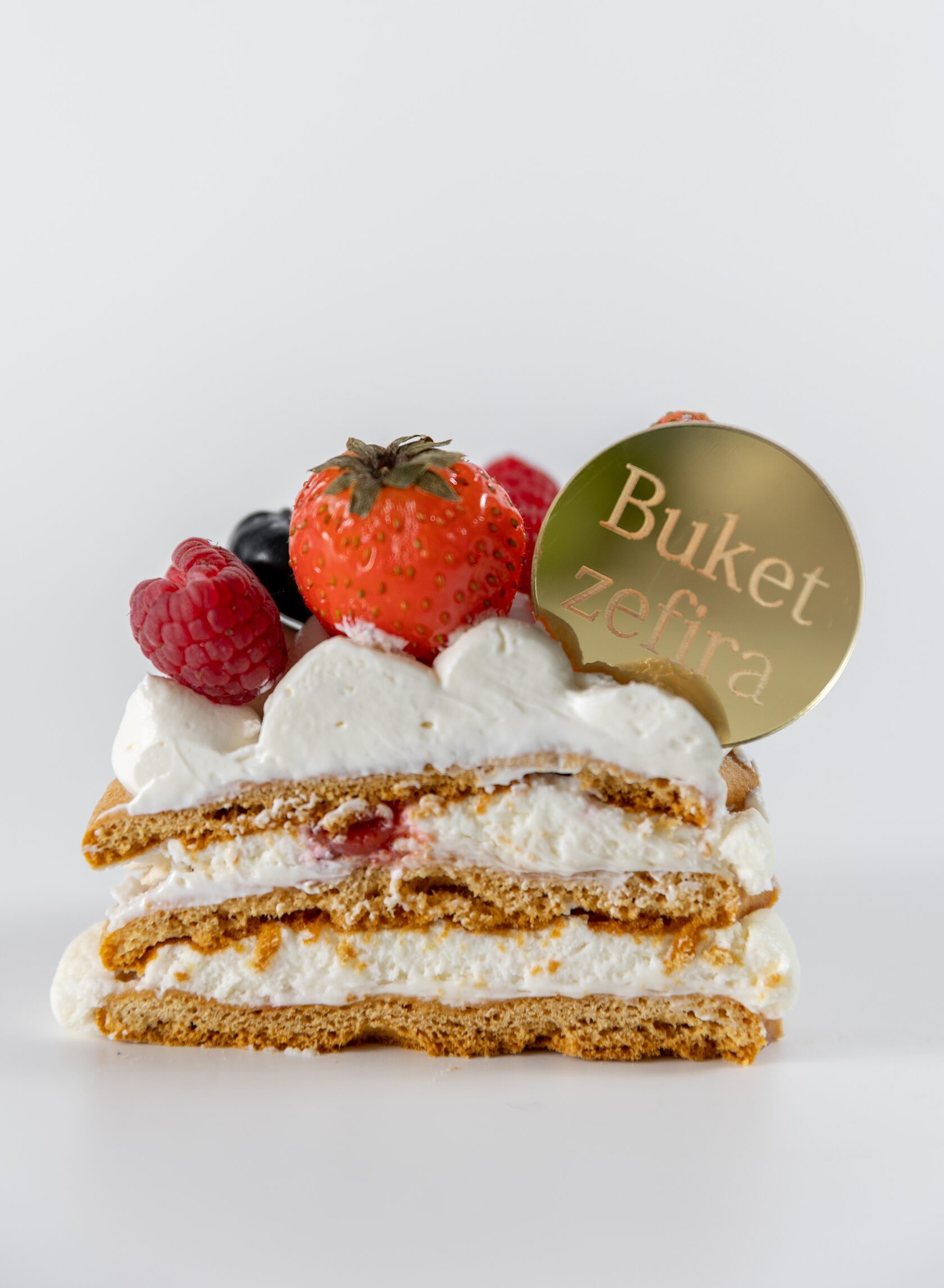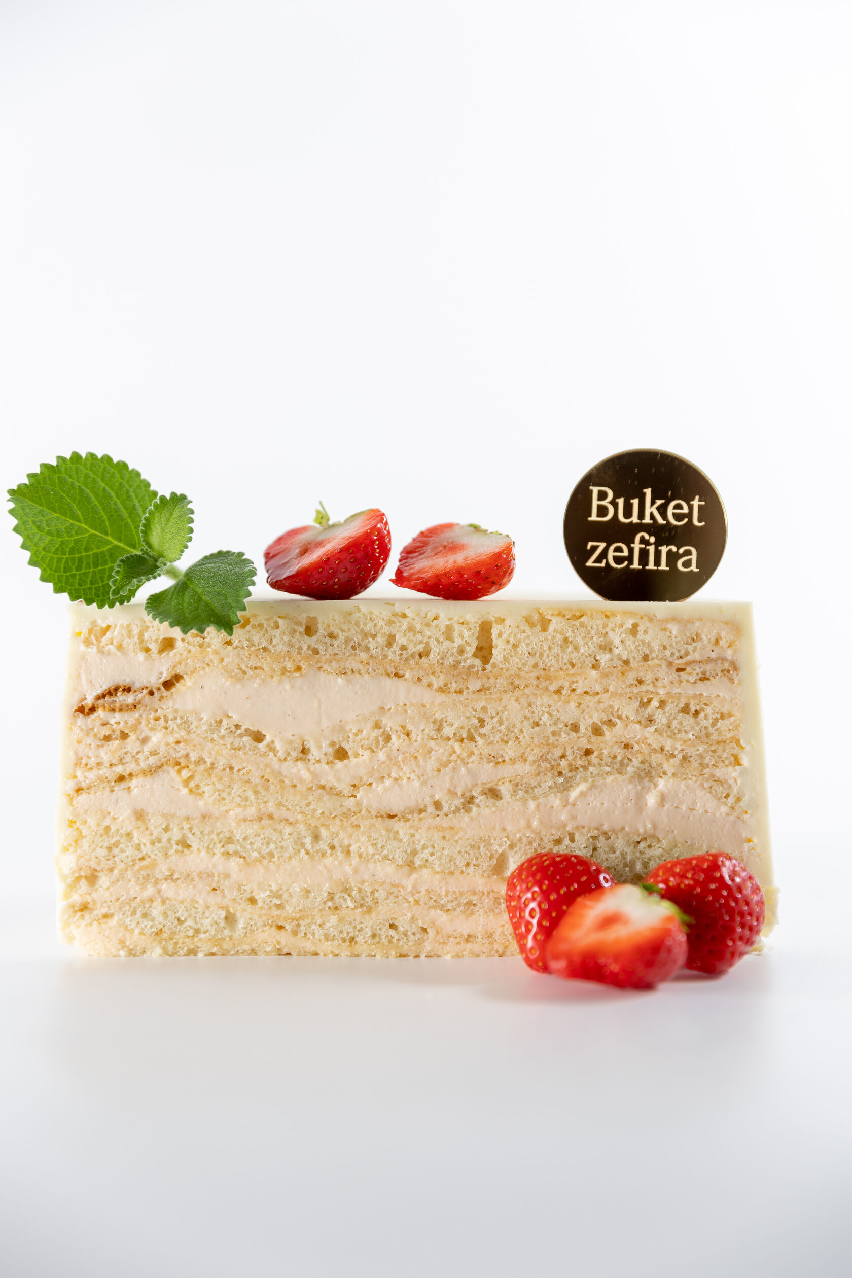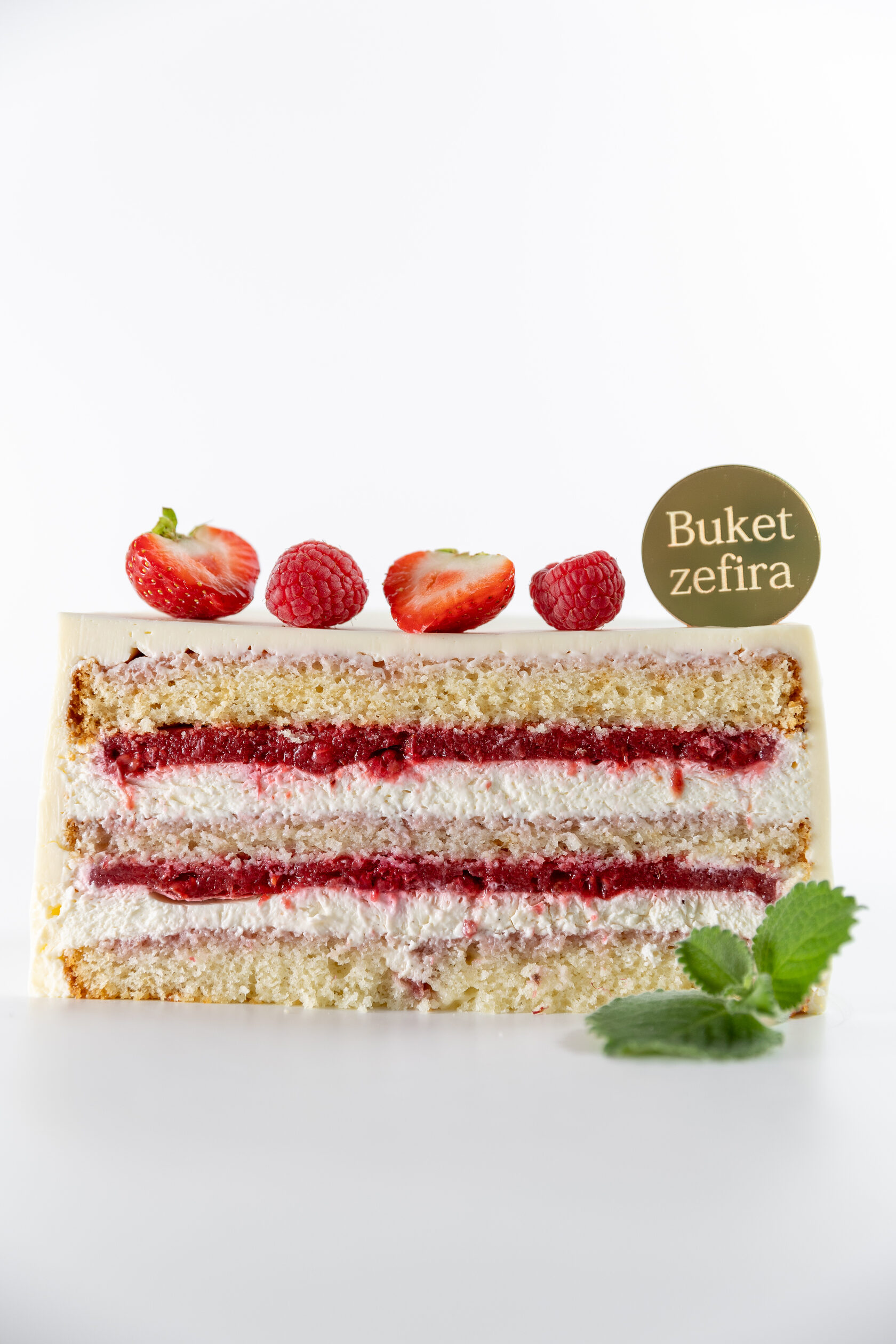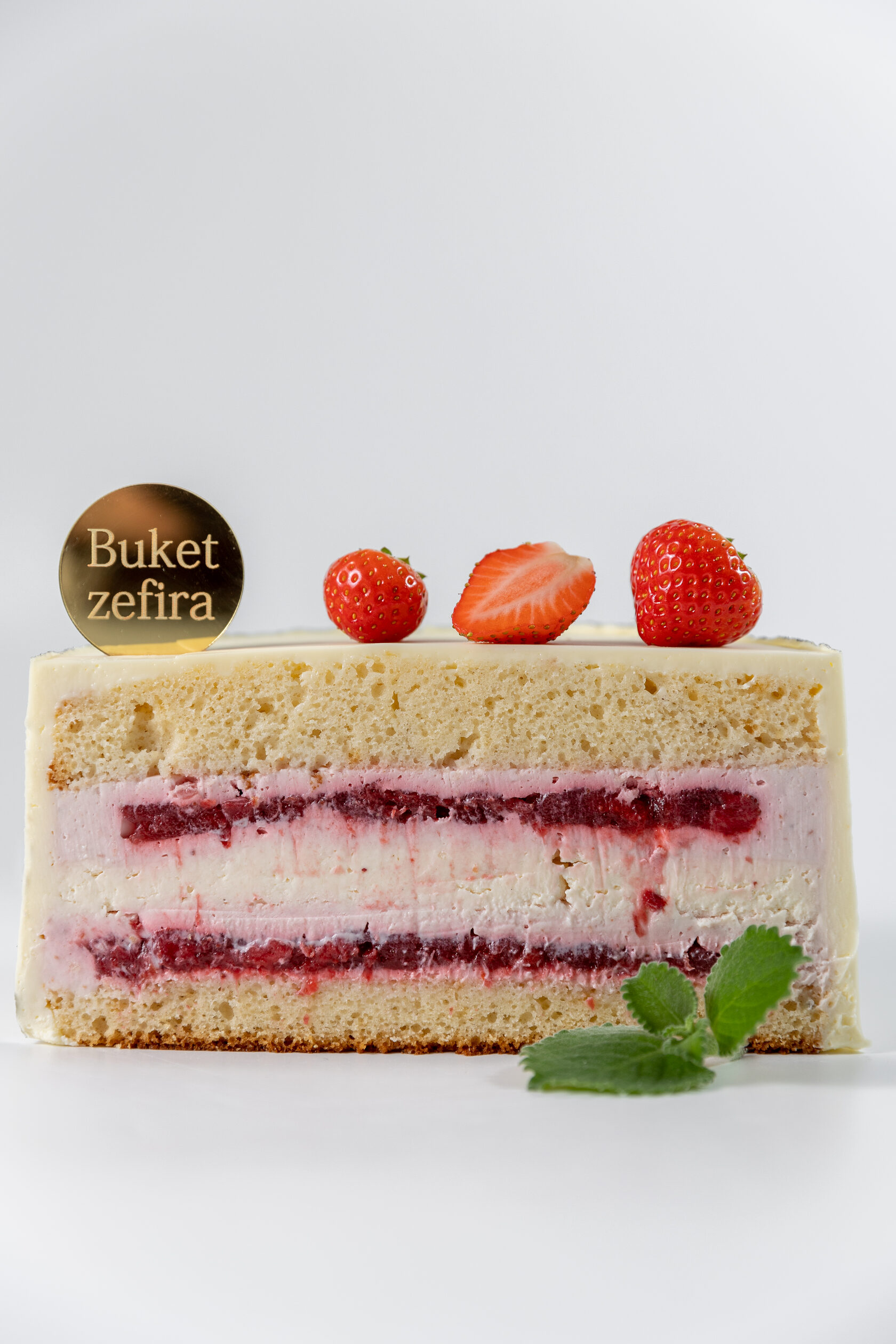 Воздушный бисквит, пропитанный клубничный смузи, ягодная начинка и сливочный мусс.