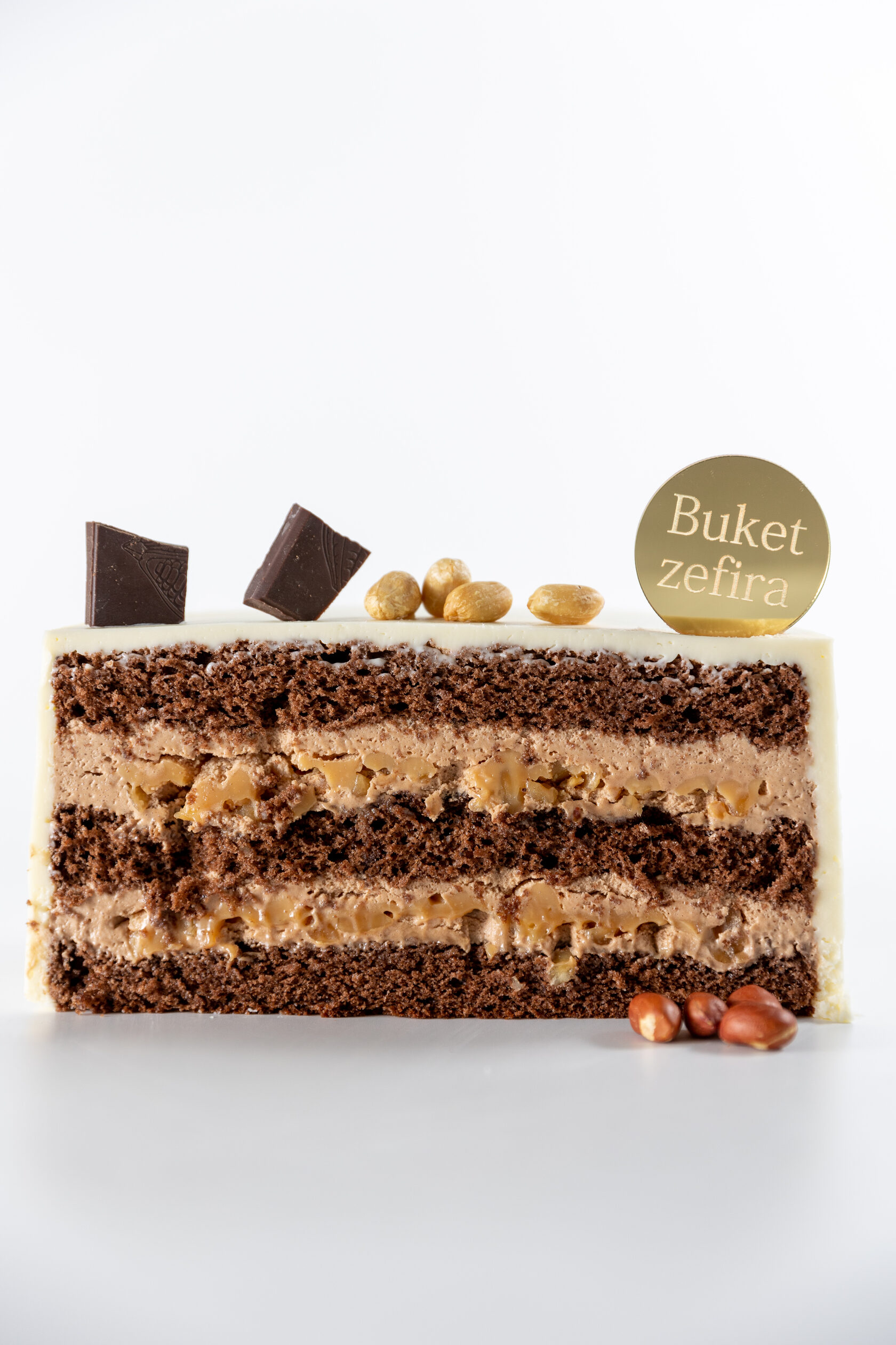 Шоколадный бисквит, нежнейшие муссы ванильный и шоколадный.
