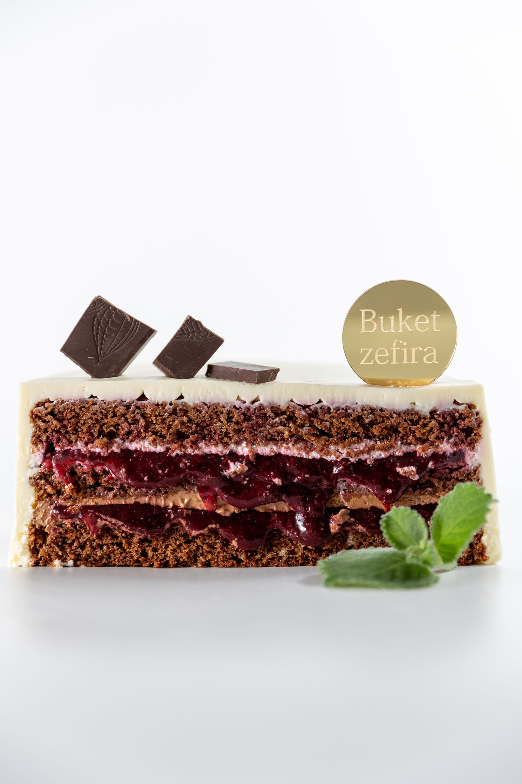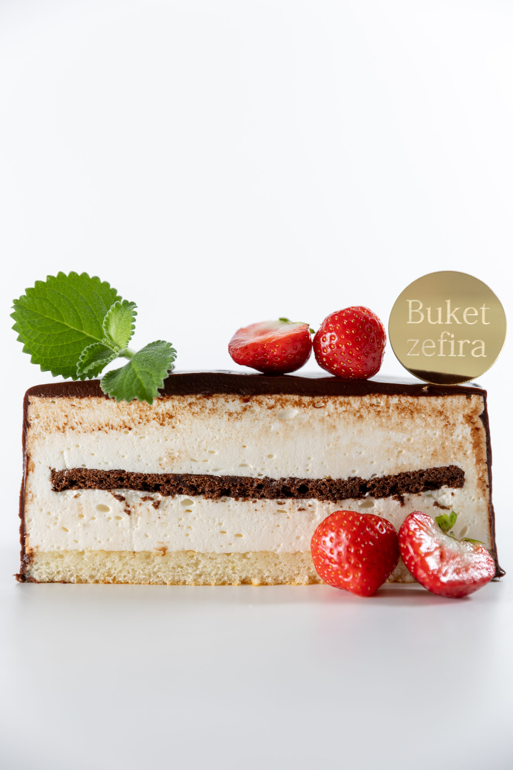 Нежное суфле на тонком бисквите, сверху торт покрыт глазурью на тёмном шоколаде.